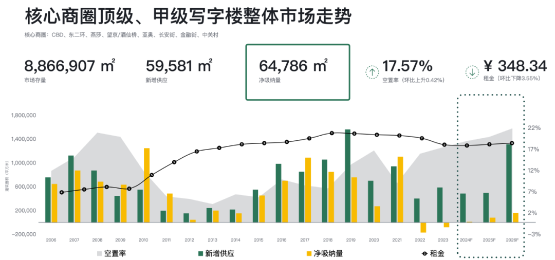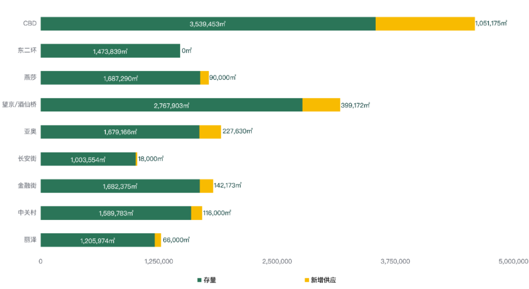 2023年全年投入市場的新增供應(yīng)量超過了110萬平方米,其中甲級寫字樓占比超過一半以上。截至四季度,多個計劃入市的新項目延后交付,預(yù)計2024年全市將會有超過100萬平方米的新增供應(yīng)入市,將為企業(yè)提供更多的選擇機會。在2024-2026年期間,全市主要商圈新增供應(yīng)量將主要集中在CBD、望京/酒仙橋及亞奧商圈;金融街、中關(guān)村、燕莎、麗澤商圈也將有新的寫字樓項目陸續(xù)投入市場。