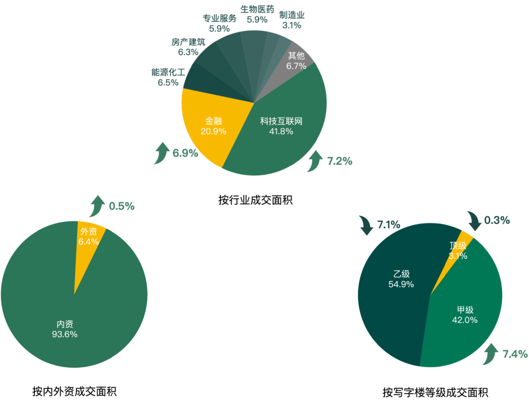科技互聯(lián)網(wǎng)、金融仍是市場成交的主力行業(yè),但本季度科技互聯(lián)網(wǎng)行業(yè)成交面積占比較上季度呈明顯上升趨勢,上升7.2個百分點;金融行業(yè)成交面積占比較上季度上升6.9個百分點,主要由于本季度各開發(fā)商以更為激進的租金吸引企業(yè)需求落地。