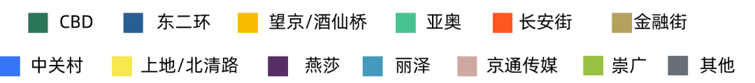 2023年第四季度,望京/酒仙橋、東二環(huán)、上地/北清路、CBD、中關(guān)村商圈是本季度成交的熱點區(qū)域,占比超過全市成交面積的50%。望京/酒仙橋商圈在本季度成交面積占比為15.2%,東二環(huán)商圈成交面積占比為11.7%,上地/北清路商圈成交面積占比為11.1%,CBD商圈成交面積占比為9.6%。