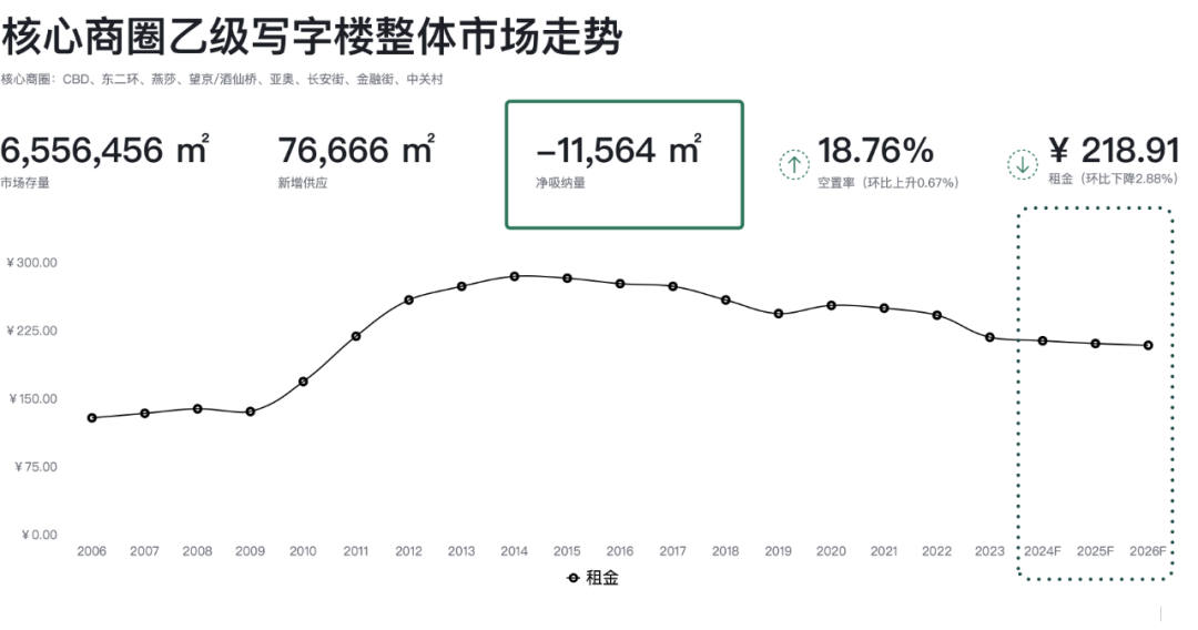 本季度核心商圈整體乙級寫字樓凈吸納量為-11,564平方米。乙級寫字樓的空置率環(huán)比上季度上升0.67個百分點,錄得18.76%;成交租金降幅顯著,環(huán)比上季度下降2.88個百分點至每平方米每月218.91元。其中望京/酒仙橋、金融街商圈的成交租金降幅明顯,環(huán)比降幅均在4個百分點或以上。